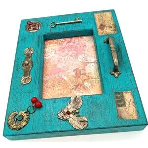 This unique wooden junk art frame features a turquoise crackle paint finish, making it a standout decorative piece for your home. The frame is suitable for 5 x 7-inch photos and comes in a landscape orientation, adding a touch of bohemian style to your space. Made from mixed materials, this original frame is embellished and perfect for showcasing your favorite photos in a distinctive and artistic way. The rear-loading design for easy photo insertion, along with the crackle finish and wall-mounted feature, make it a versatile and eye-catching addition to any collection of decorative items. Great condition.