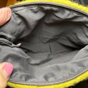 Looking for something different? This is it. A shoulder bag of bright colors made of wool. Lime green is the perfect background for blues, black, orange and purple to stand out on this bag. It features a zip closure at the top, one inside compartment with a fabric lining of black. It is 100% wool made in Nepal. The measurements are 10 inches wide and 11 inches high. No damage or flaws found. Discount Shipping