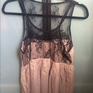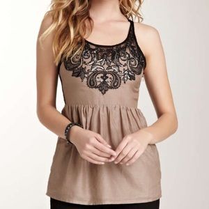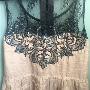 This unique top has a beautiful embroidery of muted gun metal colored sequins, lace, and some beading. Fabric is soft ( 70% cotton 30% silk). Empire cut with side zipper. Color is more of a taupe. Top of back is lace. Only worn a handful of times and received many compliments! Definitely a statement piece! Reluctantly Selling because it no longer fits me.