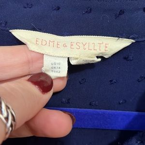 Got this at anthro years ago and it still has a ton of life left! Soft fabric (not stiff at all), puffed sleeves with embroidery detail. Some wear but good shape. Brand is Edme and Esyllte