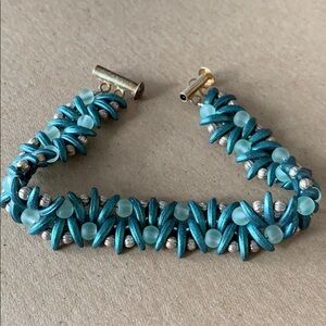 Beaded parceled made with emerald colored beads and pale colored sea glass, some small gold beads too. Length is approx 7.125 inches with slide clasp.
