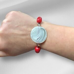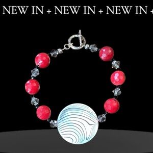 This one of a kind bracelet is so different, the pearly white stone has black swirls running throughout. Red faceted beads and smoke gray colored Swarovski crystals
