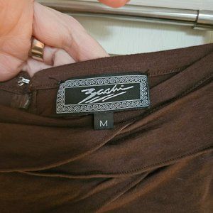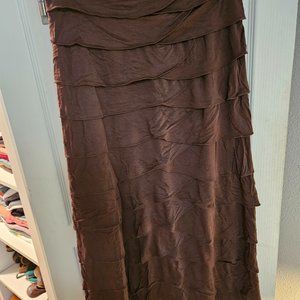 Very unique fishbone pattern skirt in a heavy jersey knit. Nice basic brown goes with so many colored tops. Body contouring shape reminds me of a mermaid tail and hits low shin. Fully lined in the same heavy stretch fabric it's very comfortable! Makes your backside look good! This is a very flattering skirt. In excellent condition. Size large.