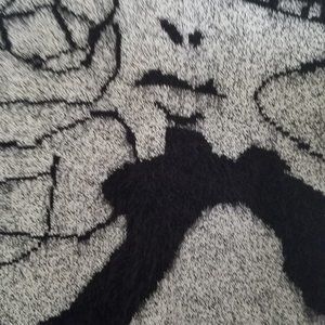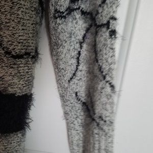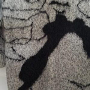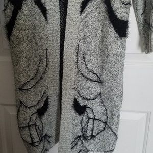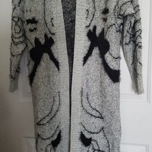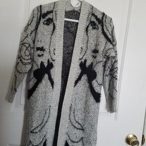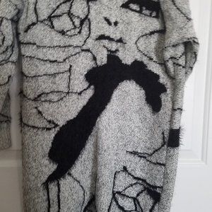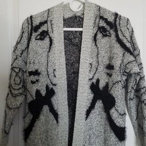 In front of the cardigan, on top at the shoulders and on the back, an abstract design takes the form of a lady's face.