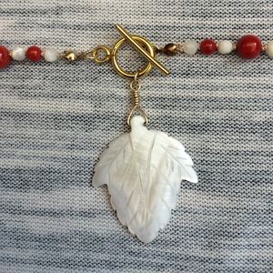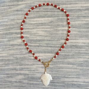 Worn once, perfect condition. Local designer. Hand-knotted red coral and mother of pearl with wire-wrapped carved mother of pearl leaf pendant. Gold-plated toggle clasp. 16" long (basically it's a choker on most folks, those who don't have skinny necks). Comes with matching coral earrings.