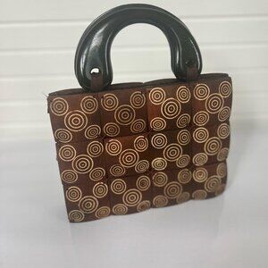 Bought in boutique on the island of Bonaire, unique coconut shell handbag with snap closure and wooden handles, bag is line with satin, excellent condition, never used.Dimensions 7.75 wide x 6 high minus the wooden handle.
