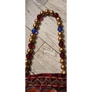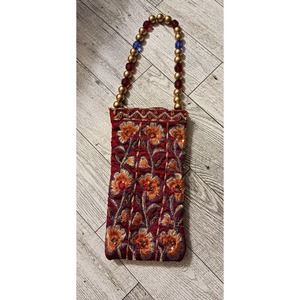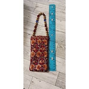 Handmade purse for a phone. 10 1/2 inches in length. 3 inches wide, the handle is made of gold, red, and blue beads. comes from a smoke free home,