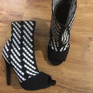 Sexy peek-a-boo 5 inch heels, excellent condition black and white with a little grey, fabric material
