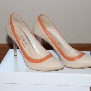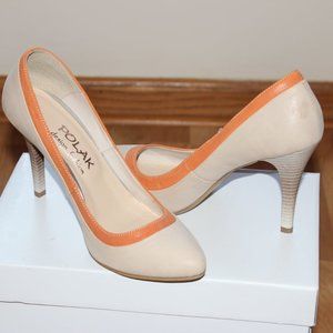 Prime leather used on those unique heels. The heel is 3 inches and they are truly crazy comfortable shoes. The heel in them is stable heel when you walk as those shoes are perfectly measured for ladies feet. Beige leather with cool orange strap. They will match any outfit you wear. Manufactured in Europe out of best leather and they will last for years of wear.