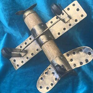 Decorative model airplane with working wheels and propeller. Not a traditional toy, more of an art piece. Made from wood and metal (possibly brass). Very unique decor for those interested in airplanes