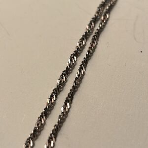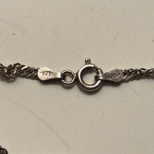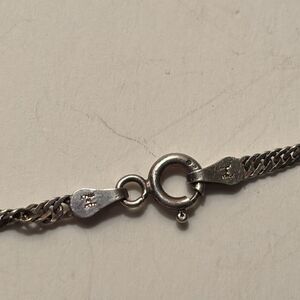 Beautiful pendant of unknown material. I want to guess some sort of metal on inside layer with some sort of glazed “pour” on top. (If you know what to call this, help your girl out…) It comes on a nice long chain with some tiny marks- hard to read even with magnifiers.