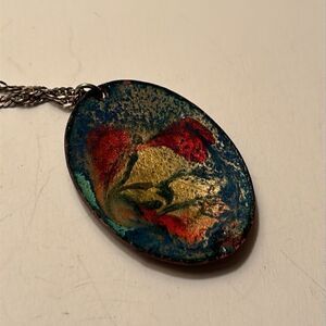 Unique multicolor blue with red swirls oval pendant with long 32” chain