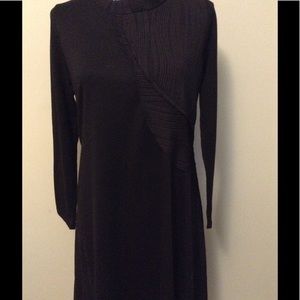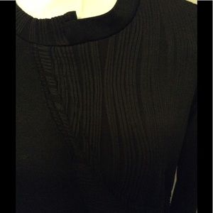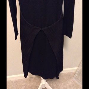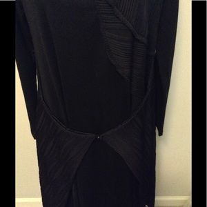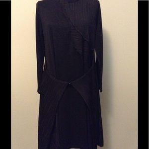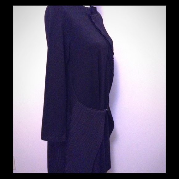 This is definitely one of a kind. You will not find any thing like this on someone else. The material is soft feels like rayon and poly mix. No label. The pleat like pattern on the sides can be worn in the front or back with single button closure. Photos doesn't do justice to this piece. Depending on height, it can be long or mid legs length. Open to offers
