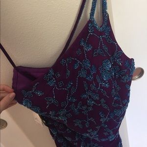 Unique dark purple and blue sequenced prom dress! With an elegant off the shoulder look and gorgeous beaded straps. Also has a ankle high cut shows off whatever adorable shoes you are wearing. Perfect condition! Super nice material! Has tags and has never been worn!