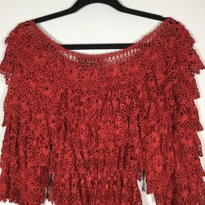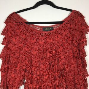 Red crocheted many’s layers unique top. Like new excellent condition. 3/4 length sleeves. Tag size Small/Medium.