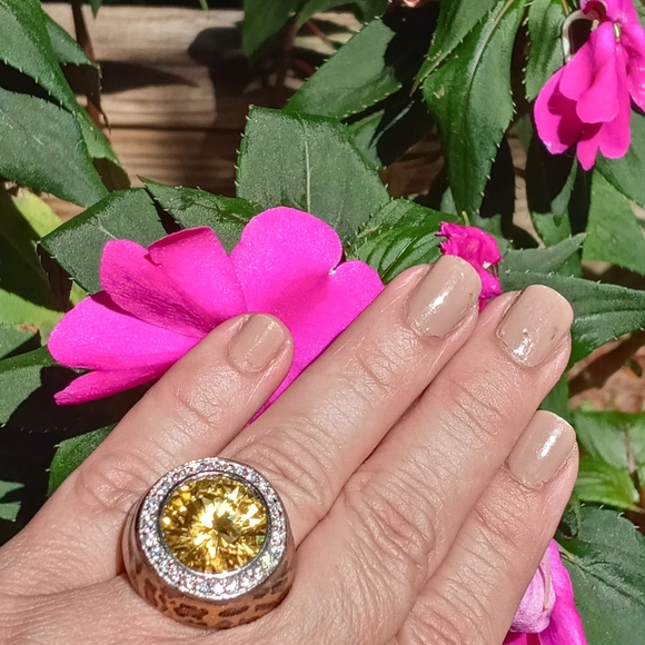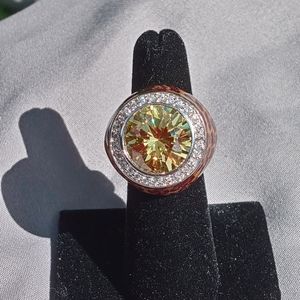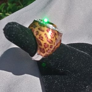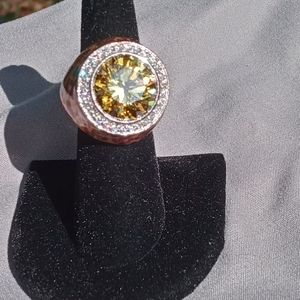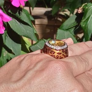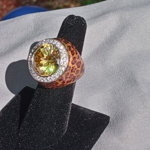 Large yellow stone with hallo of rinestones. Enamel leopard print on sides. Sterling.