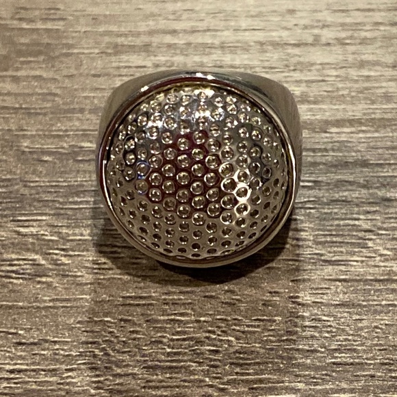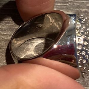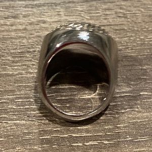 Such a unique silver ring. Can dress up or down. I believe it is a size 8.