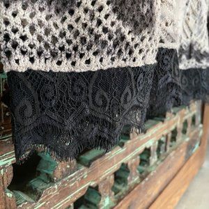 Cotton knit dress with handmade, "doily-like" patterning and stitching. Bone color with dark grey tie-dye. Black lace trimming along hem.