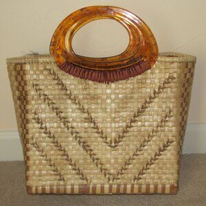 This structured upcycled bag started with a woven straw bag. The original handles were replaced with faux tortoise handles attached with leather. The front of the bag is layered with a piece of brown leather, a lace, beaded collar and a strip of faux fur. I lined the inside with a thick silk from a pillow sham. No closure mechanism as the handles keep bag closed.