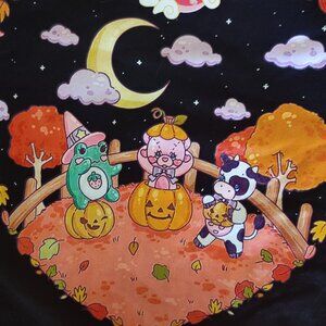 This exclusive Autumn Harvest Puff Sleeve Sweatshirt features three whimsical animal friends sharing tricks and treats on a starry Autumn night inside of a heart made of colorful foliage.