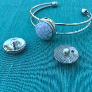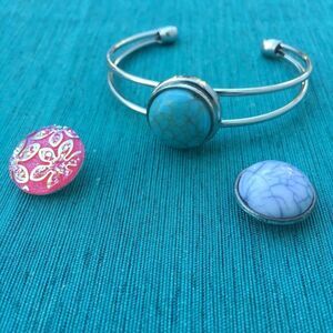 Super awesome button snap cuff bracelet with 3 snap on buttons. U can change them out to match your outfit. One snap is turquoise in color. One is gray. One is pink. New in package.