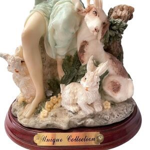 Unique Collection porcelain lady in forrest with rabbits and dog figurine. In great condition, no chips or cracks. Measures approximately 6” x 5” at base with a height of 9”.