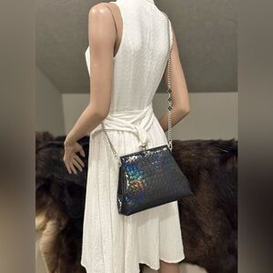 Only one available! Very uniquely stunning piece. The photos don’t do the bag justice! Handmade from special iridescent color shifting cowhide leather with embossed woven texture. Spacious enough for your phone, wallet, cosmetics, keys sunglasses, compact umbrella, & other items. Use in multiple ways, wear as a wristlet, shoulder bag, crossbody. Accessorize as a day or evening bag, or a gift for an important someone.