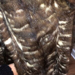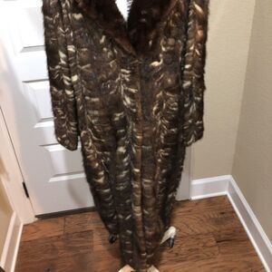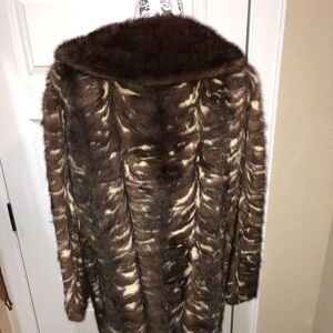 This long brown and cream mink fur coat has a large collar, hook-and-eye fasteners, and a button to change the shape of the collar. The interior is a dark brown silky material with flower stitching. The coat is in good condition and is perfect for cooler months. See pictures for more details. This is a custom made coat in a larger size. Check measurements for that perfect fit.