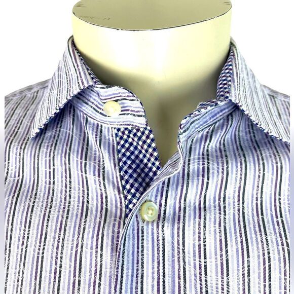 Stylish NWOT long-sleeved casual dress shirt by Thomas Dean features thin, vertical stripes in lavender, violet, black and pale purple and finished with swirly white overlay. Inside collar, cuffs and button placket feature complimentary fabric in Royal blue and violet check, with white mother of pearl buttons. It's 100% cotton and the size large measures as follows: