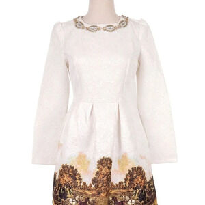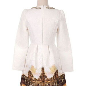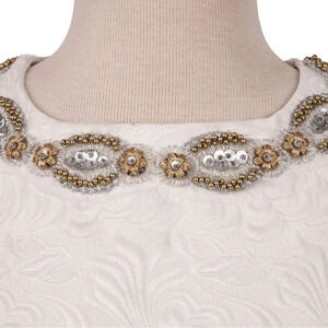 This wonderland dress is a fantasy of days past, of Victorian afternoon carriage rides down tree lined lanes. Crisp winter white fabric is delicately quilted and highlighted with silver and gold bead and sequin embellishments at the collar. Fitted in the bodice with a high waist and structured gathered skirt. Dress is lined.