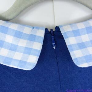 Smak Parlour fit-and-flare dress, collared, short sleeves, some stretch, back zip closure, gingham trim at collar and cuffs, blue. pockets. Rockabilly, pinup.