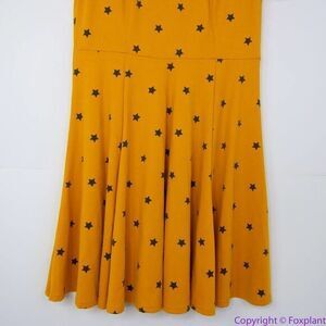 Knit fit-and-flare dress with scoop neck and short sleeves, stretch fabric, hidden back zip and hook closure, princess seams, golden yellow with black star whimsy print, unlined. Rockabilly, pinup.