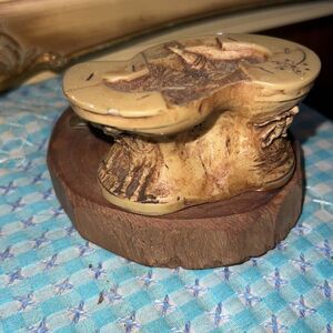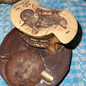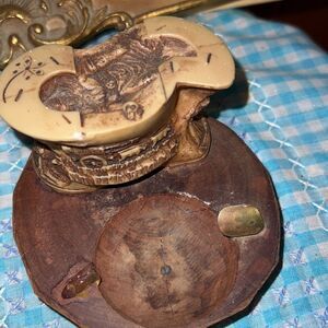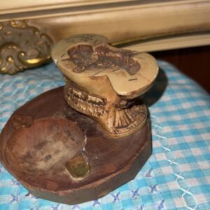 Unique mid century ashtray, appears to have a wood base and a scene of a Conestoga wagon with a cowboy on one side unknown what’s on the other side and some figure on the very top