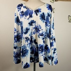Light and airy and on trend an almost antique blue print and lace trim with tassel tie and peplum bottom. Wide sleeve.