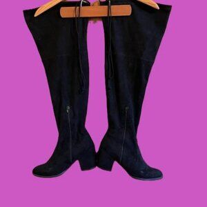 Black suede thigh high chunky heel boots. Size 11 wide calf.