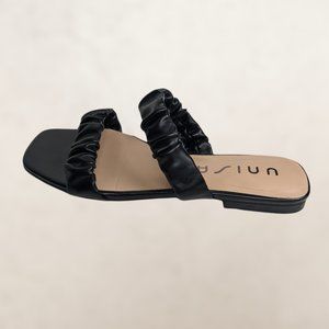 Stylish black sandals with ruffled straps. Comfortable and chic design.