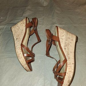 This Unisa brown wedge heel sandal with ankle strap and a strap going straight down the middle. The heel and platform side has a cork design. Size 10, slightly worn no damages