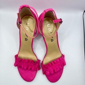 Elegant fuchsia heeled sandal with ruffle straps. Perfect for adding flair to any outfit.