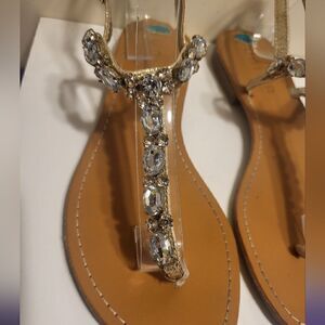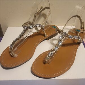 Unisa Gold Leather Rhinestone Jeweled T-Strap Flat Sandals sz.8 MSRP $120