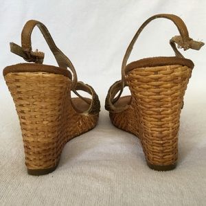 Super cute heels with rattan wedge, beading on top strap and a medallion with red accent. Never worn. In excellent condition except for small cracking on inside ankle strap and a 1/4" rattan piece missing on front of right shoe.