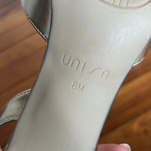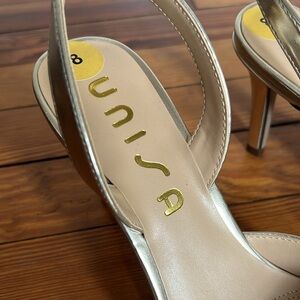 Step out in style with these elegant light gold slingback heels from Unisa. These classic pointed-toe heels are perfect for any occasion and offer both comfort and sophistication. Elasticized sling back strap. Faux leather. New without box.