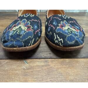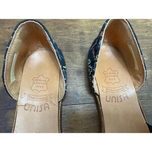 Made in Spain by Unisa. Genuine leather sole with an embroidered fabric upper. These are a standard Women's size 6. The insole is torn a bit along the sides near the back as pictured in close-up's. No stains or other blemishes.