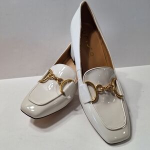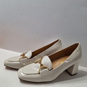 Step out in style with these chic Unisa Unlittia women’s block heel loafers in a sleek ivory patent leather finish. Featuring a stylish gold horsebit detail on the front, these shoes are perfect for elevating both casual and dressy outfits. Comfortable block heels make them suitable for all-day wear. Brand new in box.