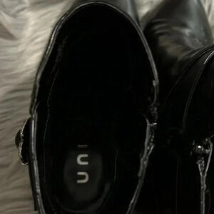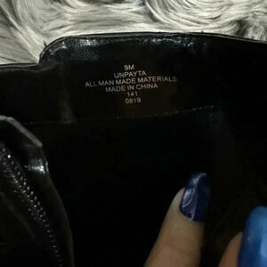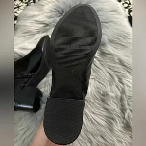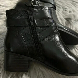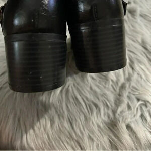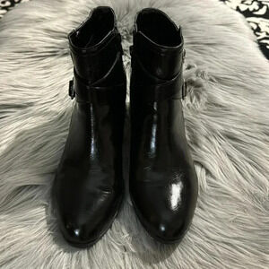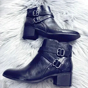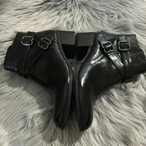 Unisa Payta Black Leather Bootie Size 9. The perfect fall & back to school shoes! Excellent condition, some small scuffs to heel as shown in photos. All sides & angles shown in photos. Cute side wrap around buckle detail. Faux leather upper, recently cleaned so they look shiny in the pics. Inside zipper closure, Round toe, 2" stacked block heel.