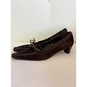 Unisa Suede Loafer Heels. Dark brown with overstitch details. Point toe. Bow detail. Size 9.5