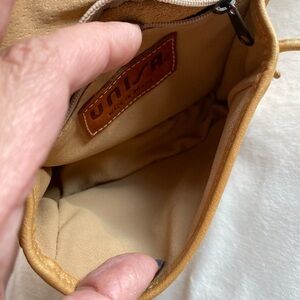 Classic and compact Unisa leather crossbody bag in a versatile tan color. Crafted in Brazil from genuine leather, this minimalist-style purse is soft, durable, and perfect for everyday use. Features a front flap with magnetic snap closure, inner zipper pocket for secure storage, and a long crossbody strap for hands-free convenience.