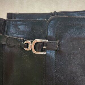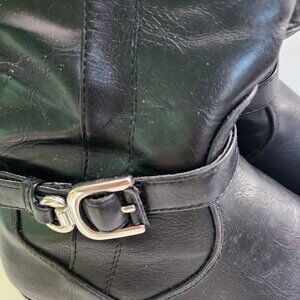Unisa Untriplee -J Knee High Black Leather Riding Boots, Size 7.5. Zip Closure, 1" Heel, 16.5" High, Elastic Gusset Down Entire Back For Wider Calves, Comfort, Silver Buckle Detail. Good Pre-Owned Condition