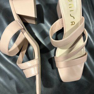 Like new, worn once to a wedding. Very Comfy shoe with chunk heal in Light Pink