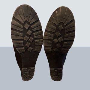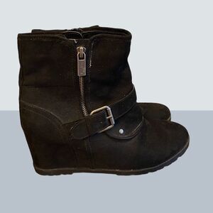 Cute! pair of women's Unisa black, suede, wedge ankle booties. Side zipper and adjustable buckle.