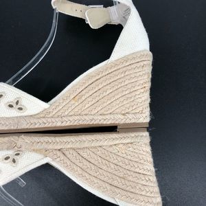 Adorable sandals for spring, featuring a canvas/burlap like uppers, with embroidered eyelet floral detailing with mesh, adjustable ankle strap, rounded toe, espadrille wedge.